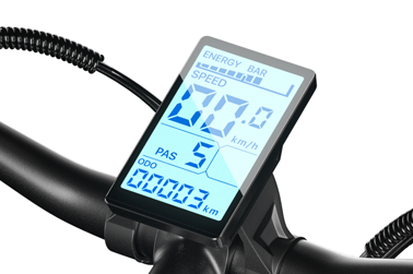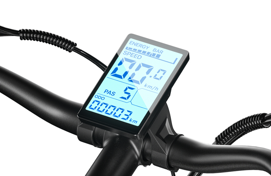 The MX03 features the KING-METER NOKEE-U series waterproof display. It shows total mileage, battery level, speed, and speed settings from 1 to 5. The display is equipped with three buttons, located next to the left handlebar, which control the electric mode, pedal assist mode, and light on/off.